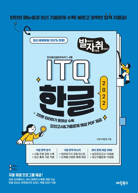 소개: 한국생산성본부(KPC) 시행 ‘국가공인 정보기술자격 ITQ‘ 시험 준비에 최적화된 수험서입니다.“발빠르게 자격증을 취득한다!”라는 슬로건을 가진 ‘발자취 ITQ’는 최신 출제유형이 100% 반영된 수험서로, 탄탄한 매뉴얼과 최신 기출문제가 수록되어 있습니다. 과년도 기출문제를 완벽히 분석하여 출제 가능성이 높은 유형의 문제부터 심화까지 고득점으로 합격할 수 있도록 구성된 교재입니다.[발자취] 합격 Point!첫째, 시험 준비에 필요한 모든 과정을 단계별로 구성하여 쉽게 이해할 수 있습니다.둘째, 출제 패턴 분석이 반영된 실습 예제를 반복 학습하여 실력을 향상시킵니다.셋째, 실전모의고사와 최신기출문제를 통해 시험을 완벽하게 대비할 수 있습니다.